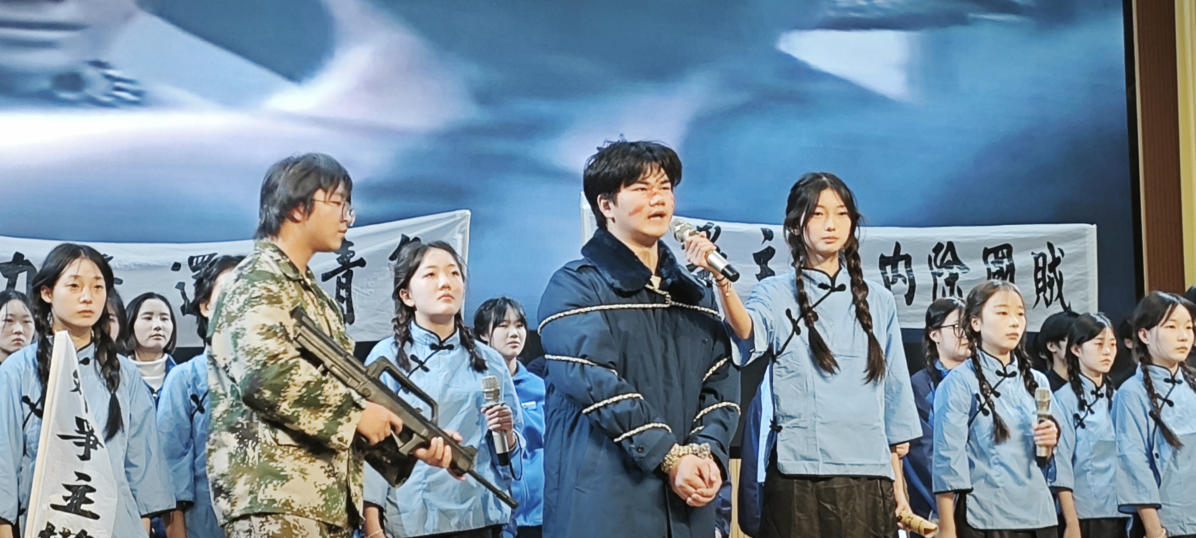 哪里有硝烟,哪里就有反抗;哪里有危难,哪里就有勇士;哪里有青年,哪里就有希望。八十九年前的一二九运动是那群青年学生们谱写的战歌,天地浩然气,如今涤荡在校园。参赛选手们别出心裁,用心准备,他们有的身着民国时期学生装,手拿战斗标语,挥舞着旗帜,高举着横幅,大声喊着“中华民族要站起来”、“振兴中华”等口号;有的则扮成革命先辈的样子,重现当时先辈们浑身伤痕,被押解上刑场的场景;有的他们身穿校服,饱含深情集体朗诵,展示出汉师学子的精神风貌。