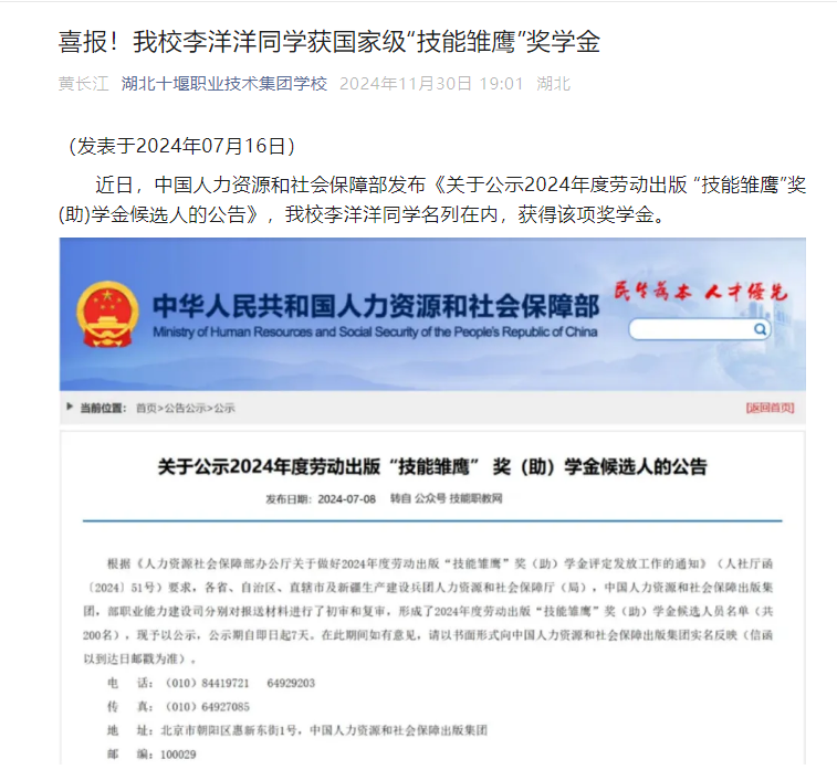 除此之外,还有22133班的李洋洋同学,他勤奋刻苦,努力钻研专业技能,积极参加各类竞赛,成绩喜人,曾荣获2023年湖北省第二届技工院校学生职业技能大赛汽车技术赛项银牌;2023年获“湖北省技术能手”称号;2022-2023学年中等职业教育国家奖学金;2024年湖北工匠杯技能大赛——第二届全国乡村振兴职业技能大赛湖北省选拔赛金牌。近日,中国人力资源和社会保障部发布《关于公示2024年度劳动出版 “技能雏鹰”奖(助)学金候选人的公告》,我校李洋洋同学名列在内,获得该项奖学金。