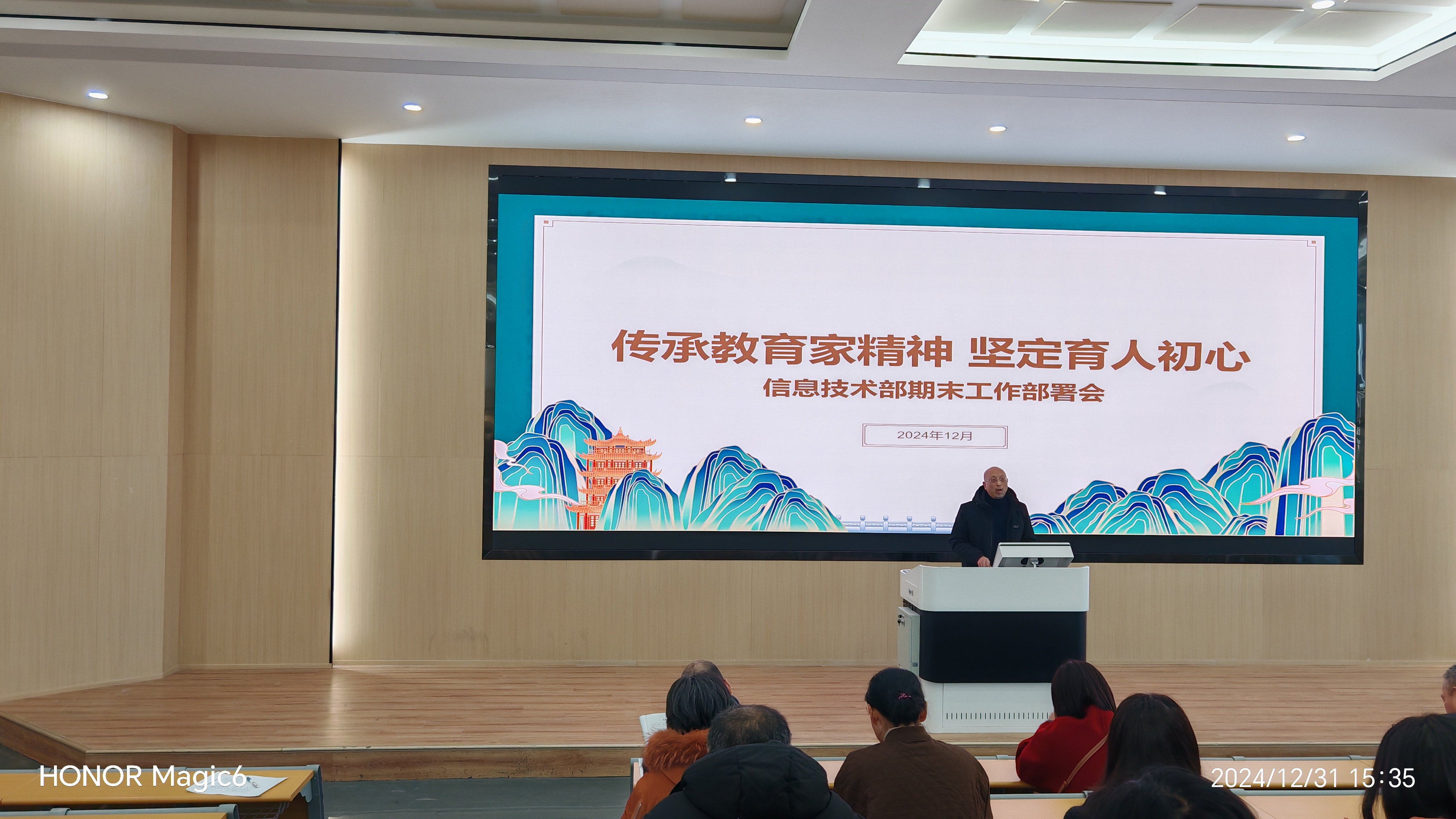 12 月 31 日,信息技术部期末工作安排部署会暨全体教职工大会成功举行,会议以“传承教育家精神,坚定育人初心”为主题。学院副校长陈俊红、系部主任王建国、教学主任郭建新分别发表重要讲话,强调全员教师岗位聘用制及落实教育系统三大行动方案,为全体教职工明确工作方向。