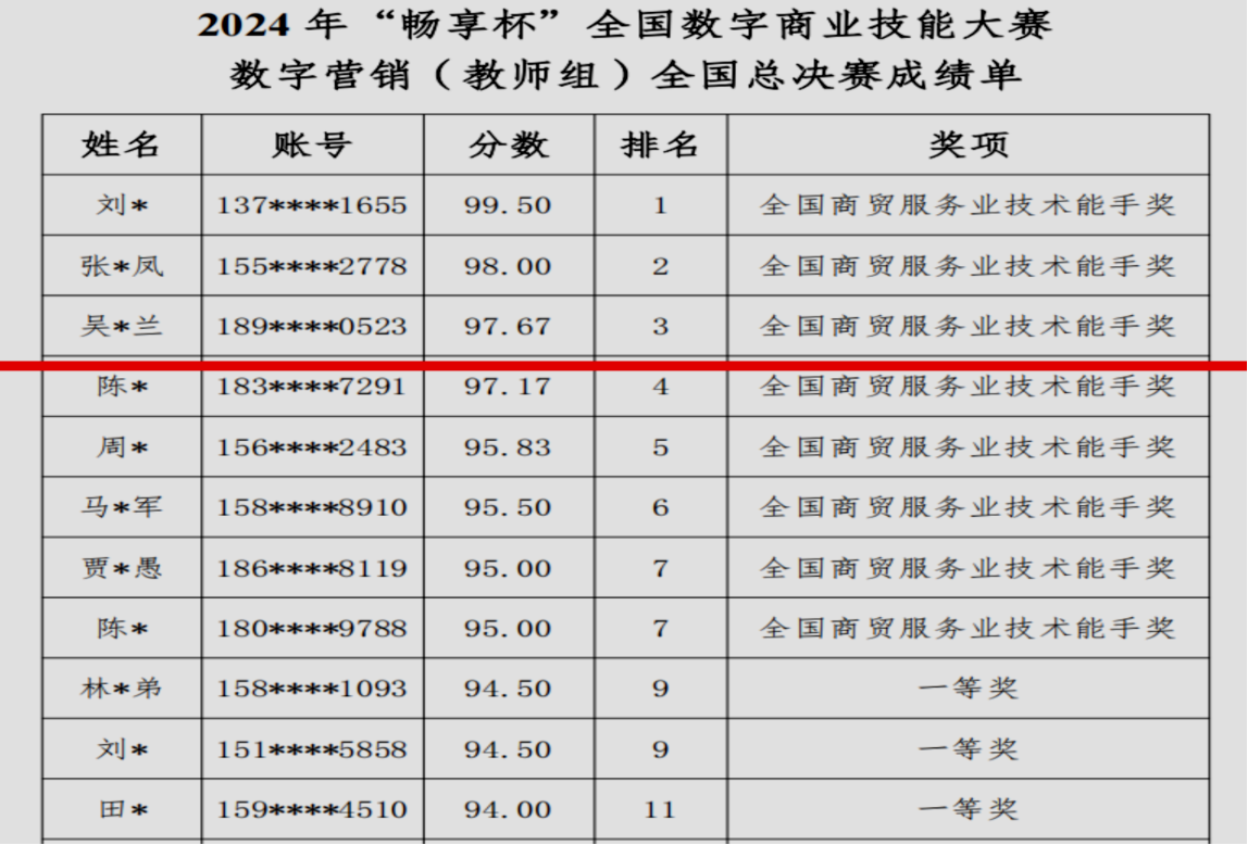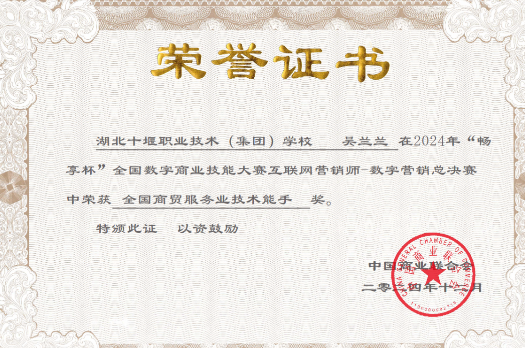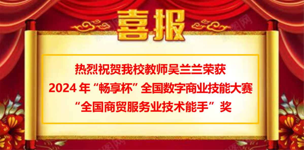 近日,由中国商业联合会主办的2024年“畅享杯”全国数字商业技能大赛总决赛圆满落幕。我校信息技术部教师吴兰兰一路披荆斩棘,从全国80余名中职、高校教师中脱颖而出,最终以第三名的成绩斩获数字营销总决赛“全国商贸服务业技术能手”奖。此项荣誉是吴兰兰老师继荣获“湖北省技术能手”“全国商业服务业技术能手”之后的又一殊荣。