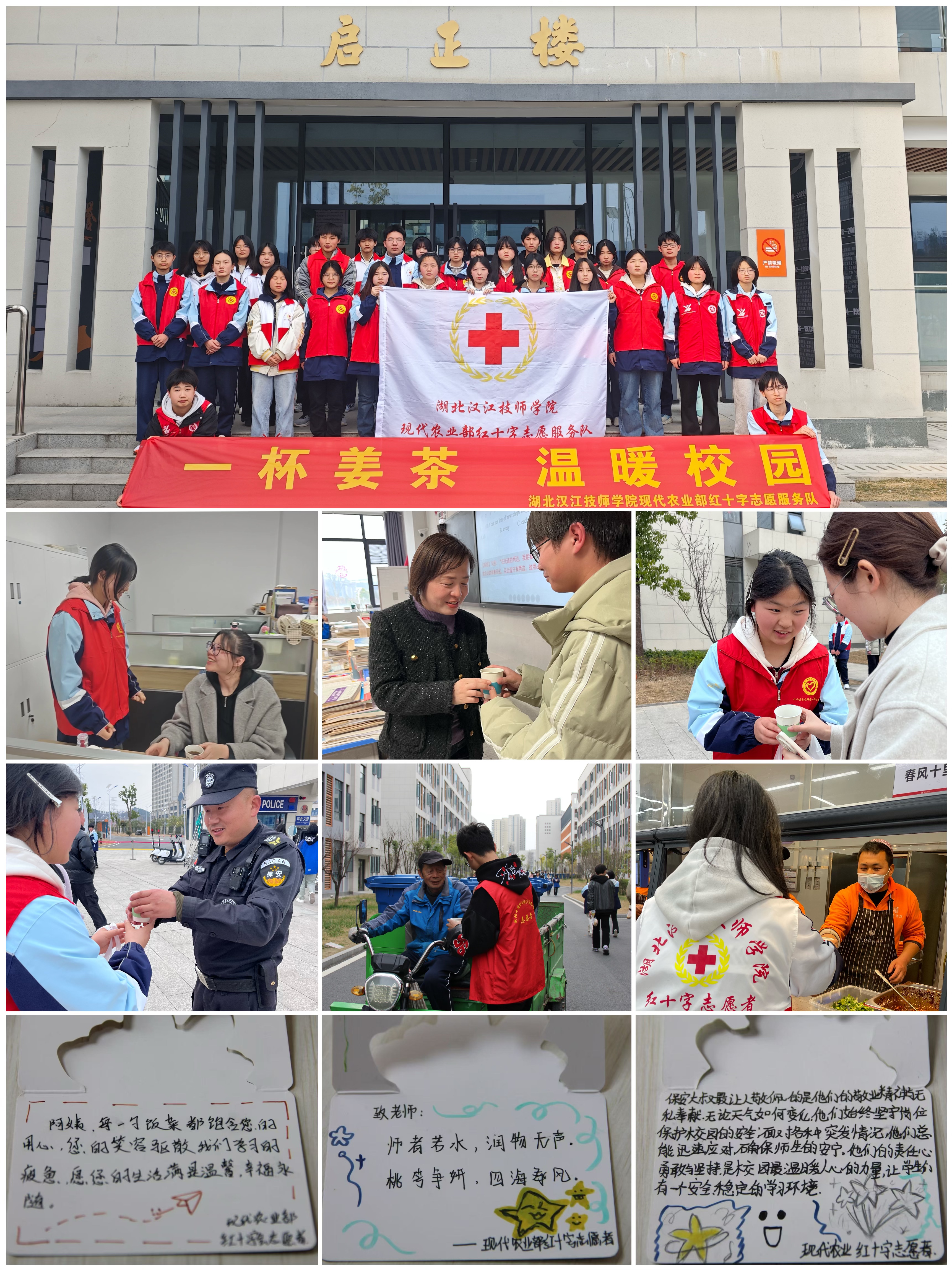 三月寒意未散,但校园内却洋溢着浓浓的温情与暖意。为弘扬新时代雷锋精神,表达对老师及校园工作人员的感恩之情,增强学生的社会责任感,3月11日下午,现代农业部红十字志愿服务队学生利用课外活动时间,开展了一场意义非凡的“一杯姜茶,温暖校园”志愿服务活动,为坚守在校园各岗位的老师及工作人员送去春日的温暖与祝福。