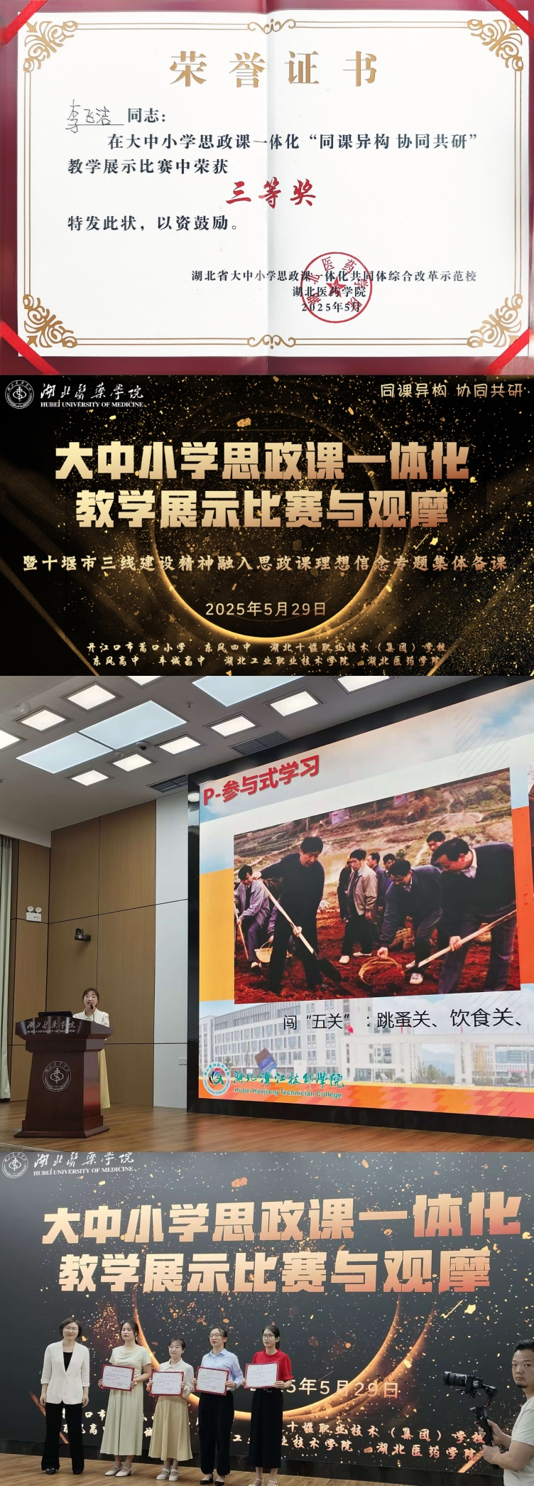 5月29日下午,大中小学思政课一体化共同体“同课异构 协同共研”教学展示比赛与观摩活动暨十堰市三线建设精神融入思政课理想信念专题集体备课活动在湖北医药学院盛大启幕。湖北医药学院党委常委副院长谭艳,市委宣传部副部长周义波,社科联副主席温明,市教育局汤莉副书记等领导参加活动并担任比赛评委。我校作为共同体成员学校,思政课部精心准备,积极参与此次活动,彭德峰主任受邀担任评委,思政课部李飞洁老师作为参赛选手表现卓越,荣获教学展示比赛三等奖。