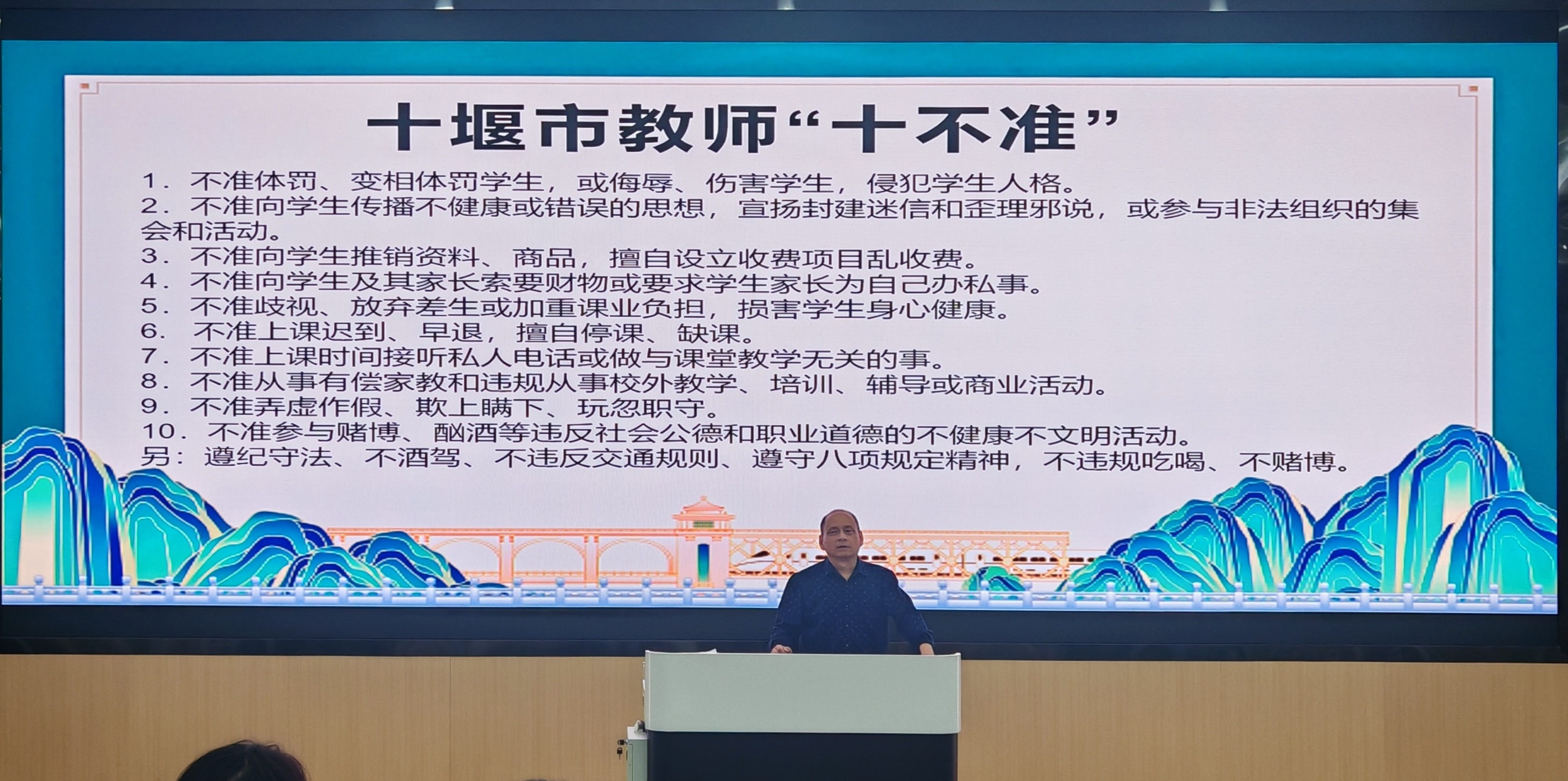 随后,教学副主任郭建新带领全体教职工重温了学校关于加强教学管理的系列文件,再次强调了教学纪律、考勤制度及各类教学表单的规范填写要求,并领学了“教师职业道德规范”及“十堰教师“十不准”原则”,对调换课纪律等作了重点强调。