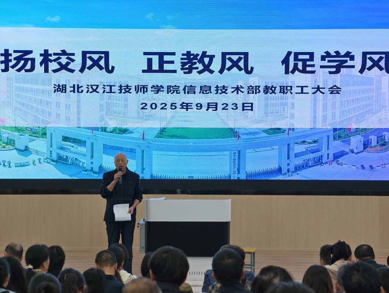 为深入贯彻落实学校新学期工作精神,统一思想,明确方向,凝聚合力,9月23日下午,信息技术部在二号楼阶梯教室召开主题为“扬校风、正教风、促学风”的学部全体职工大会。
