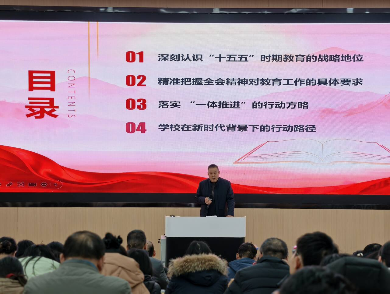 会议第一议程,由党委委员、副校长陈俊红领学党的二十届四中全会精神核心要义。陈俊红围绕四个核心主题进行了深入阐述:一是深刻认识“十五五”时期教育的战略方位,强调教育作为国之大计、党之大计,在全面建设社会主义现代化国家新征程中的基础性、先导性、全局性地位,要求教师们胸怀“国之大者”,扛起为党育人、为国育才的神圣使命。二是精准把握全会精神对教育工作的具体要求,指出要全面贯彻党的教育方针,聚焦立德树人根本任务,将高质量发展作为生命线。三是落实“一体推进”的行动方略,强调要促进信息技术与教育教学、管理服务的深度融合与创新。四是明确学校在新时代背景下的行动路径,提出要主动对接国家重大战略需求,优化学科专业布局,深化教育教学改革,打造高水平师资队伍,为发展新质生产力提供强有力的人才与智力支撑。