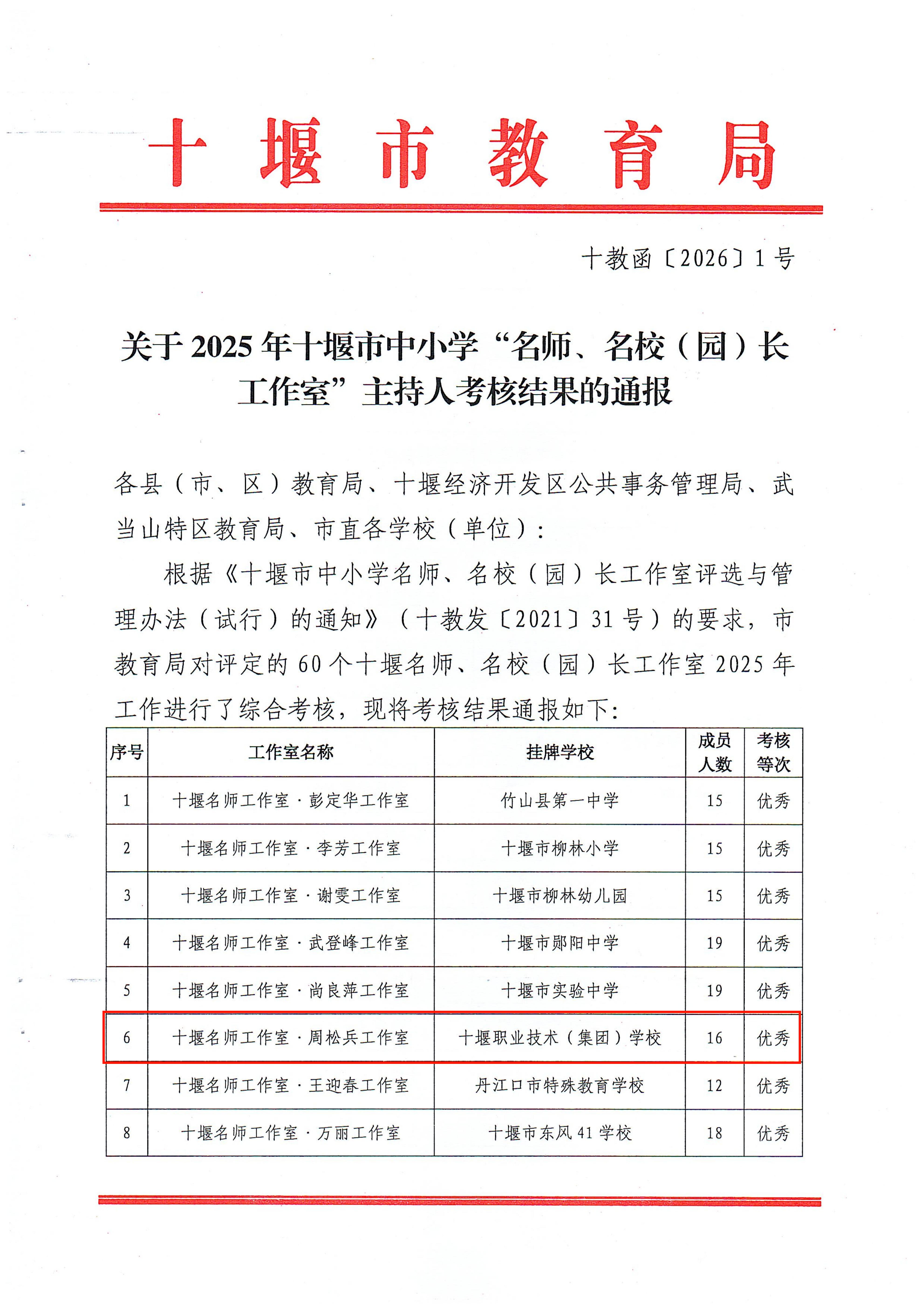 近日,十堰市教育局公布2025年度中小学“名师、名校(园)长工作室”综合考核结果,我校周松兵名师工作室顺利通过考核并荣获“优秀名师工作室”称号。