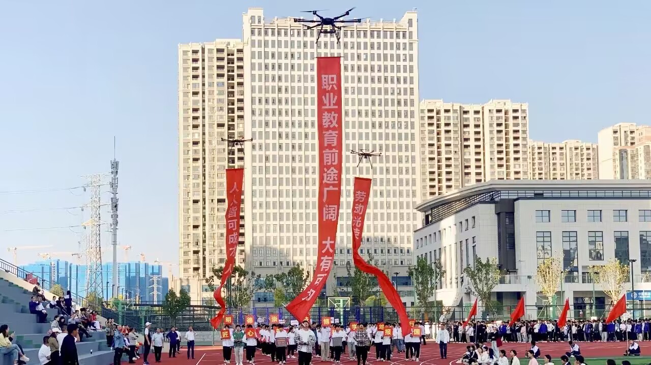 三架无人机悬挂着红色条幅,宛如三位领航的使者,在最前方引领着电气工程部的荣耀征程。“职业教育前景广阔,大有可为”,这句标语如同一盏明灯,照亮了电气工程部学子们前行的道路,彰显着职业教育在新时代的重要地位和光明前景。它激励着同学们在专业学习中不断努力,为自己的未来拼搏,为职业教育的蓬勃发展贡献力量。“人人皆可成才,人人尽展其才”,则传递出一种温暖而坚定的信念,让每一位同学都感受到自己的价值和潜力。在电气工程部这个大家庭里,无论起点如何,每个人都有机会绽放属于自己的光彩。“劳动光荣,技能宝贵,创造伟大”,这句口号则如同一座坚实的丰碑,彰显着劳动的价值、技能的重要性和创造的伟大力量。它提醒着同学们,要以辛勤的劳动为基础,不断提升自己的技能水平,勇于创造,为社会的发展贡献自己的智慧和力量。