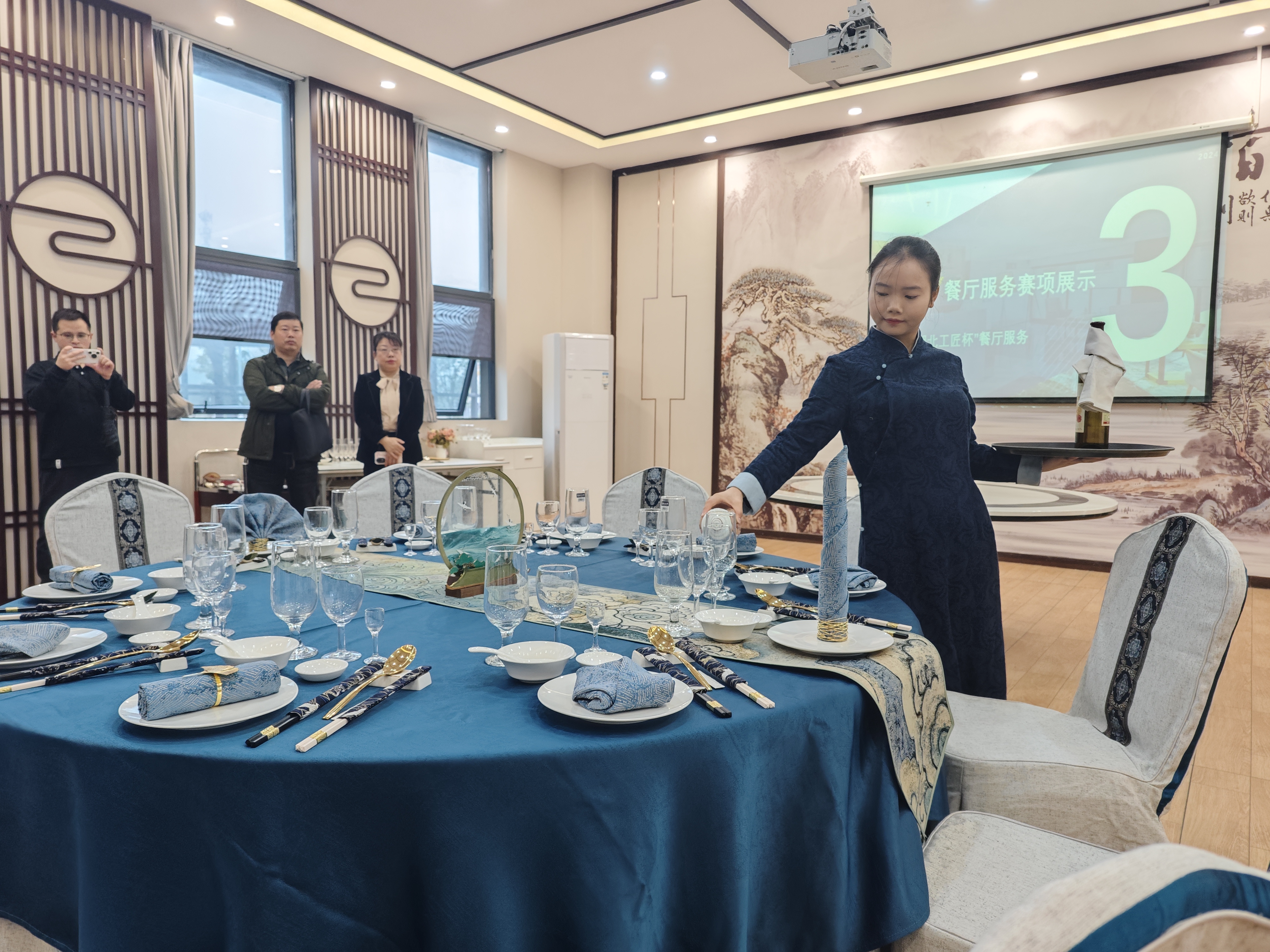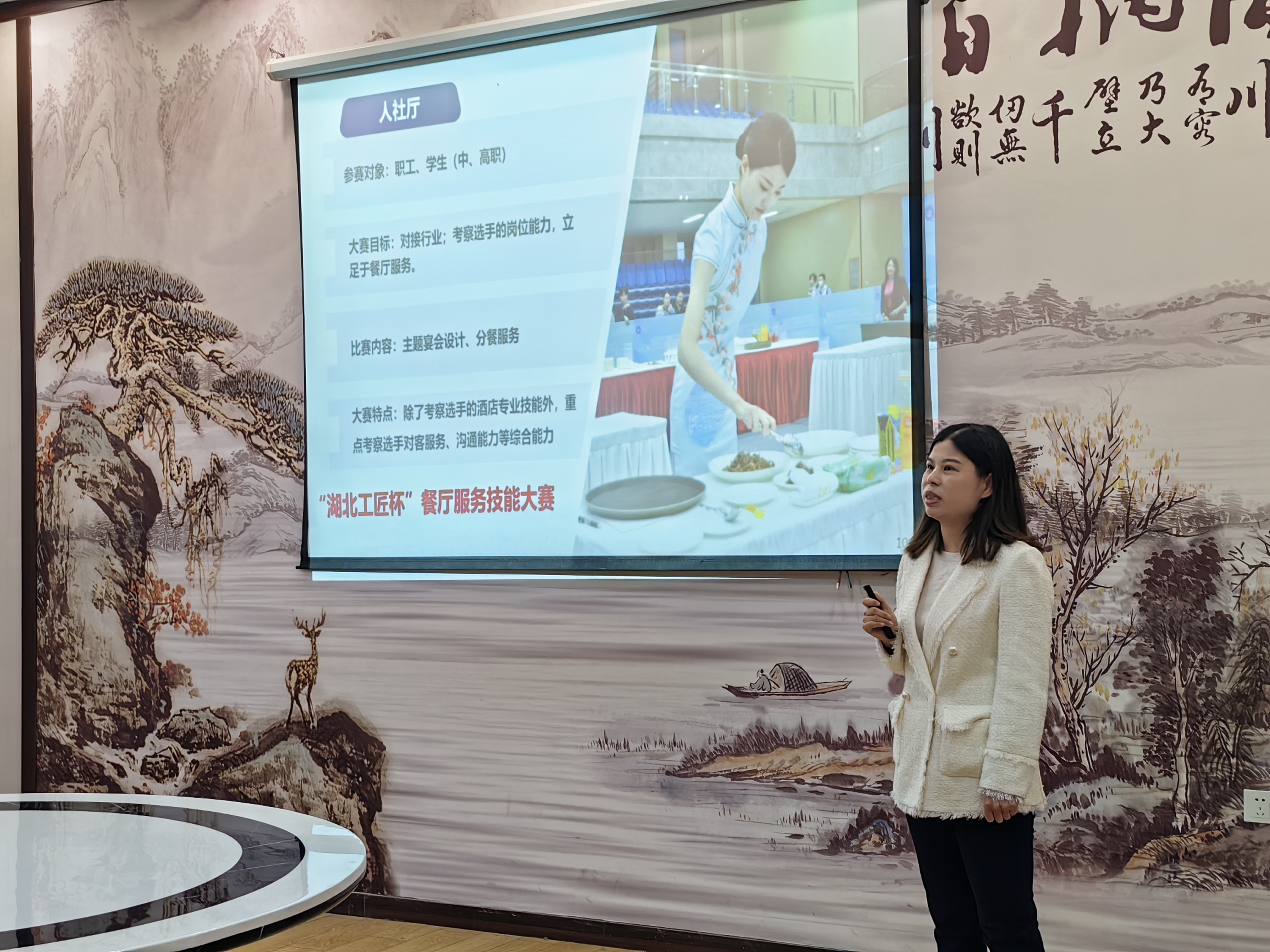 活动中,我校高星级酒店运营与管理专业的胡宇恒老师以“中餐服务”赛项规程解读与展示为题,分享了学校在湖北工匠杯餐厅服务赛项中的备赛经验,并用“四个到位”总结了参赛心得,即规则解读、细致程度、基本功扎实和职业素养培养都要到位。“湖北工匠杯”大赛获奖选手骆慧仪向与会教师展示了综合素养和中餐摆台,赢得了阵阵掌声。