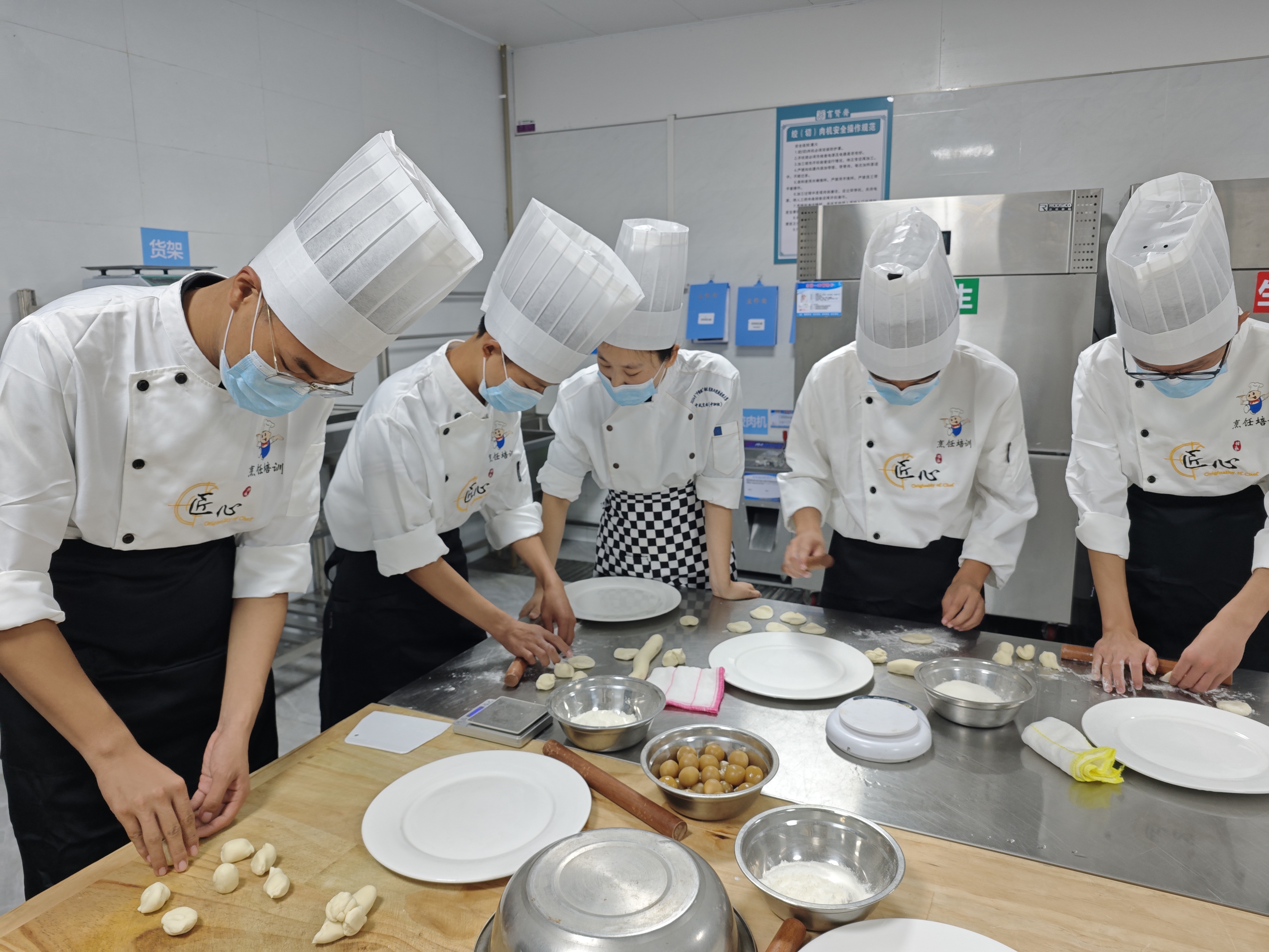 在四食堂面点房,竹溪县职业技术学校的秦玉蓉老师为大家带来了一节精彩的中式面点工艺课。她不仅介绍了月牙饺、白菜饺、知了饺等成型手法,还带领我校24313中餐烹饪专业的四名同学现场操作制作了精美的面点成品。竹溪县职业技术学校的王佳怡同学向我们展示了雕刻基本功,萝卜在她的手里也变成了栩栩如生的牡丹,获得老师们的高度赞誉。