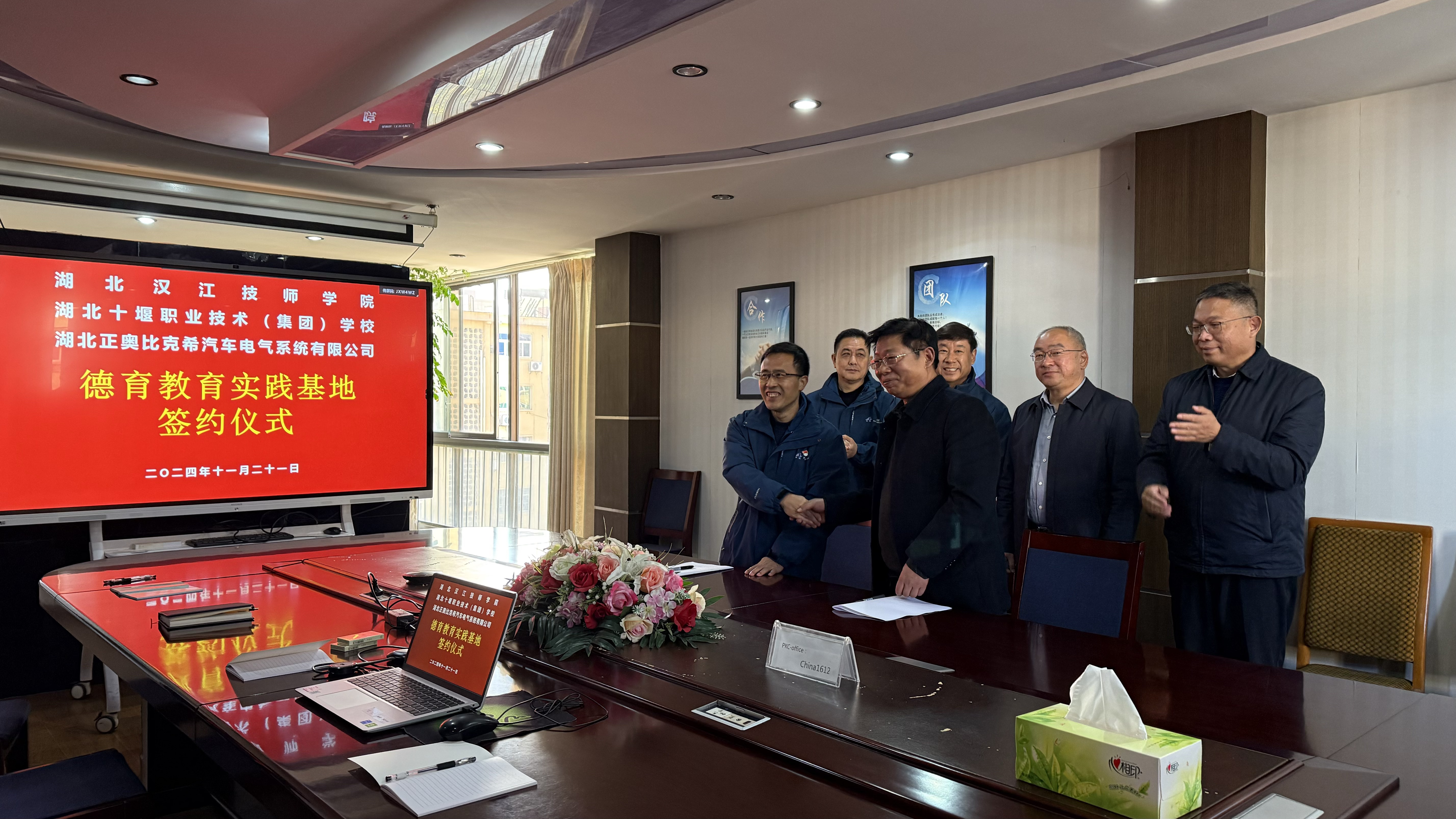 2024年11月20日上午,湖北汉江技师学院与正奥比克希汽车电气系统有限公司正式签订德育教育实践基地协议,汉江技师学院党委副书记刘铭、副校长徐卫、思政课部主任彭德峰、招生就业办主任王强等领导出席活动。这一协议的签署,标志着双方在校企合作和德育教育领域的合作迈出了坚实的一步。