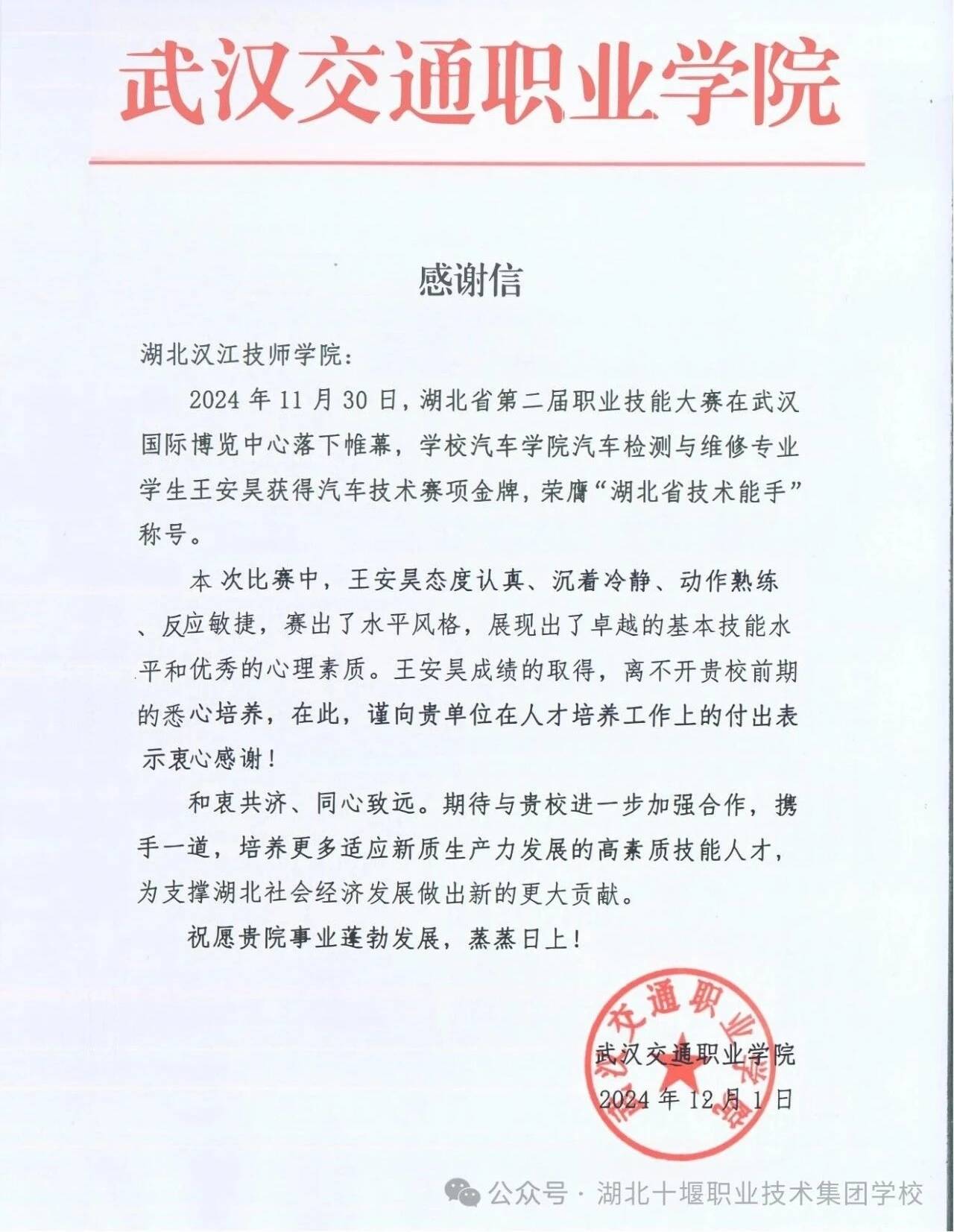 这是一封来自武汉交通职业学院的一封感谢信,信中的王安昊同学是湖北汉江技师学院(原十堰市高级技工学校)汽车维修专业2005班学生,班主任廖兴琛。在指导老师廖兴琛、黄长江指导下,王安昊2021年参加十堰市中职大赛汽车维修赛项荣获三等奖,2022年参加十堰市中职大赛汽车维修赛项荣获第一名。2023年技能高考以579分考入武汉交通职业学院汽车检测与维修专业,现为武汉交通职业学院23汽车检测与维修三班学生。