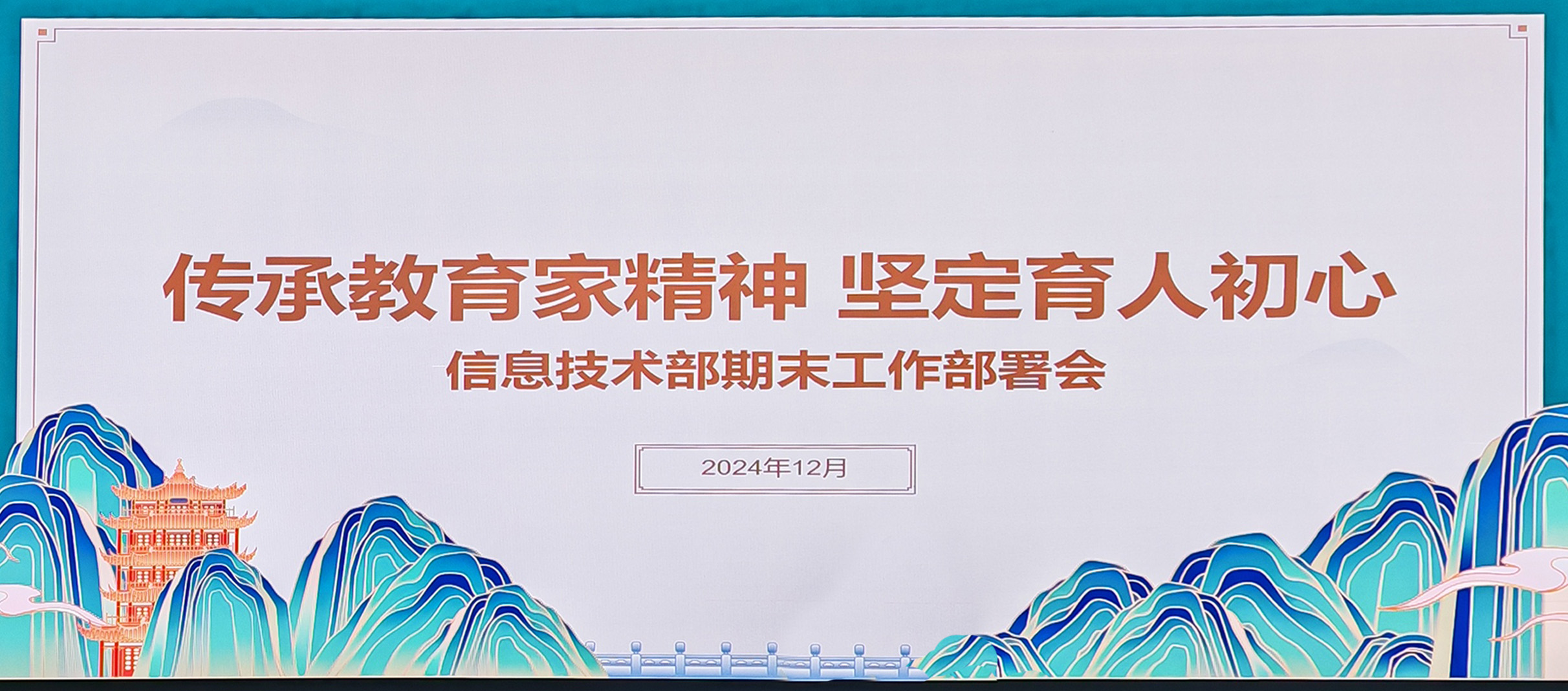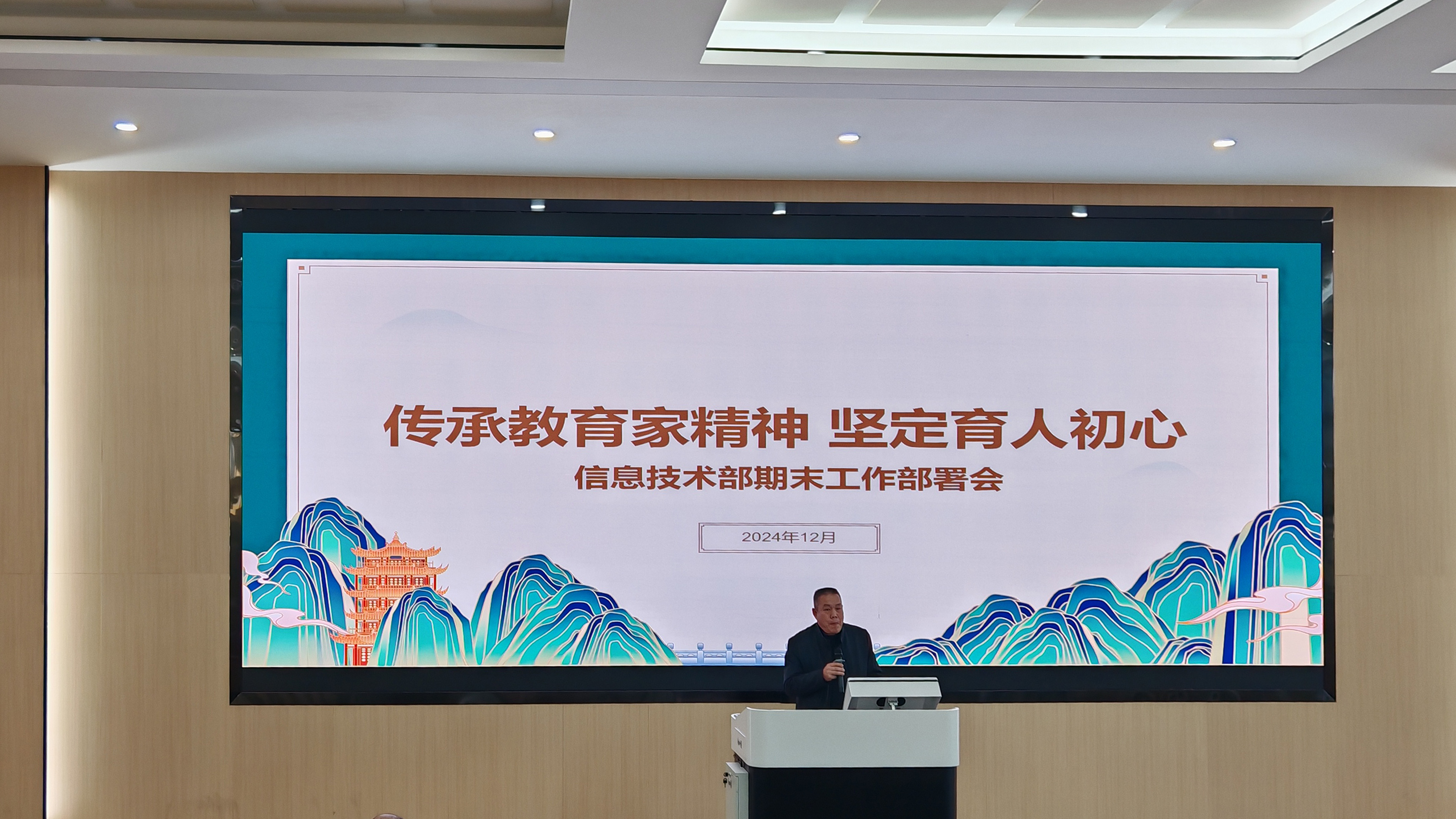 12 月 31 日,信息技术部期末工作安排部署会暨全体教职工大会成功举行,会议以“传承教育家精神,坚定育人初心”为主题。学院副校长陈俊红、系部主任王建国、教学主任郭建新分别发表重要讲话,强调全员教师岗位聘用制及落实教育系统三大行动方案,为全体教职工明确工作方向。