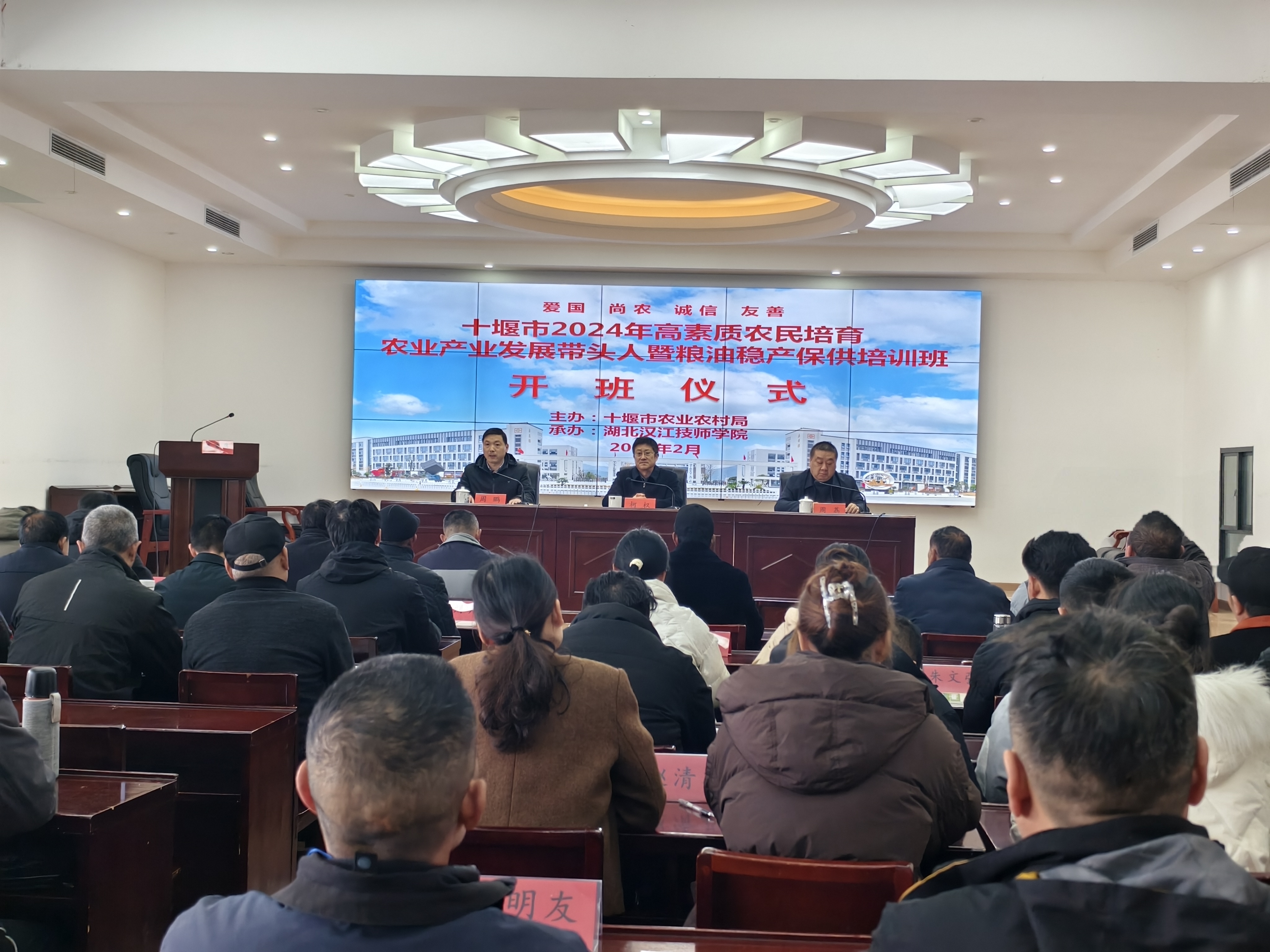 为贯彻落实习近平新时代中国特色社会主义思想和中央一号文件精神,促进粮油稳产保供和特色产业发展,着力培养一批扎根农村、知农爱农的高素质农村实用人才,2月25日,由十堰市农业农村局主办,湖北汉江技师学院承办的十堰市2024年农业产业发展带头人暨粮油稳产保供培训班在湖北汉江技师学院丹江校区开班。张湾、茅箭区84名学员参加开班仪式。