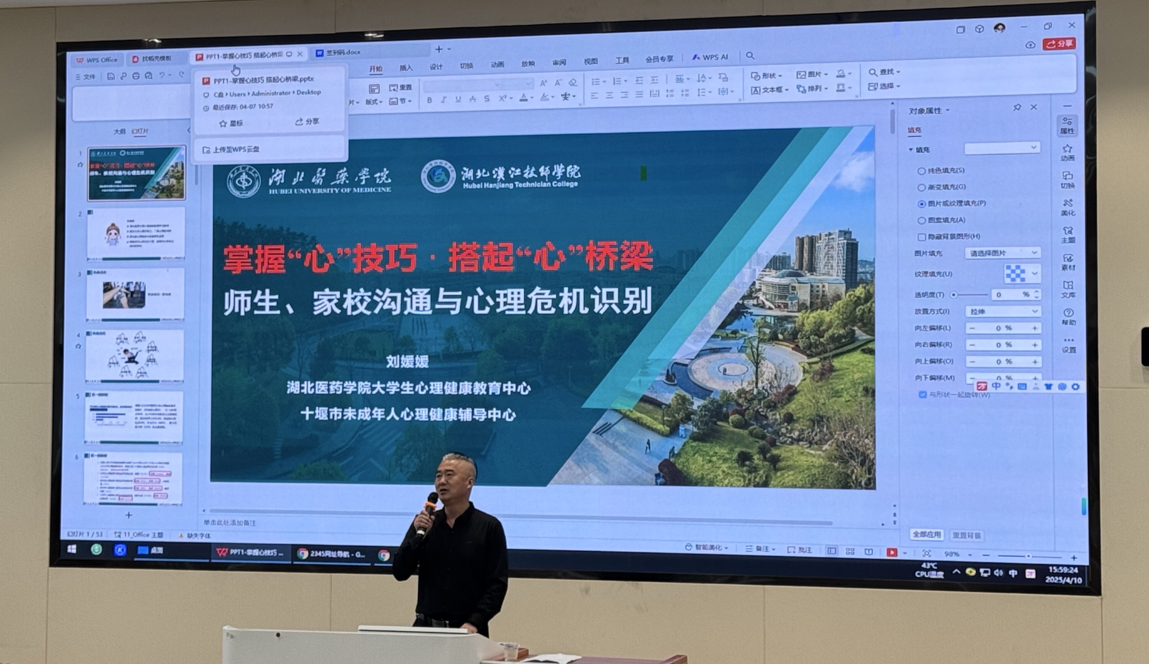 为提升班主任沟通能力和心理危机识别水平,4月10日16:00,学工处举办“掌握‘心’技巧,搭起‘心’桥梁”专题讲座。校党委委员、副校长陈俊红出席并讲话,学工处副主任胡寿洪主持,讲座邀请湖北医药学院大学生心理健康教育中心教师刘媛媛主讲,214个班主任及相关教师参加培训。