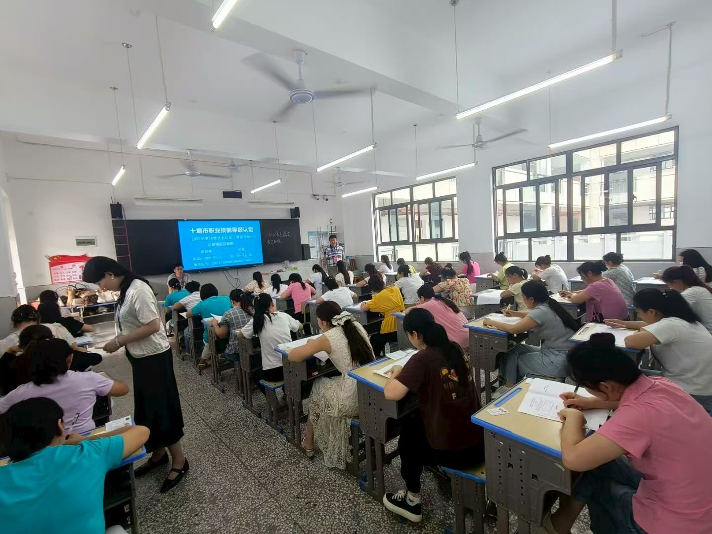 7月以来,技能鉴定中心全体人员牺牲暑假休息时间,连续作战,完成多项技能鉴定考评。5号完成111名“农业经理人”高级工认定考试、9日完成城区第十七批“电子商务师”考试,10日转战竹溪县继续组织118名“保育师”和26名“汽车维修工”中级等级认定考试,13日又将赶赴竹山嘉麟杰服饰公司,为201名“缝纫工”进行技能等级认定。