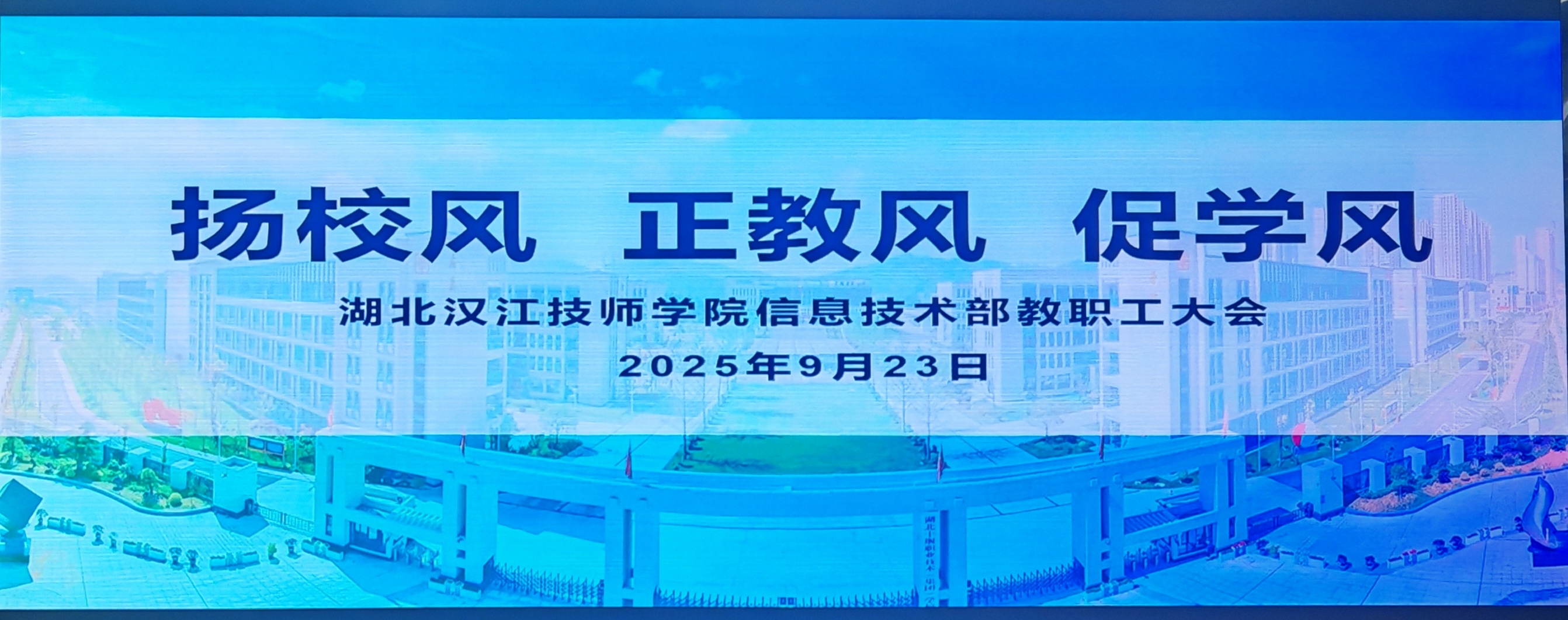 为深入贯彻落实学校新学期工作精神,统一思想,明确方向,凝聚合力,9月23日下午,信息技术部在二号楼阶梯教室召开主题为“扬校风、正教风、促学风”的学部全体职工大会。